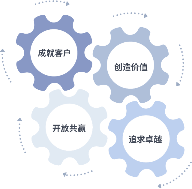成就客户是一切决策的出发点,,,,创造价值是衡量所有工作的标准,,追求卓越是我们做事做人的态度,,,开放共赢是我们的格局也是最终的结果。。价值观的齿轮环环相扣,,,推动着组织里的每个人不断向前。。